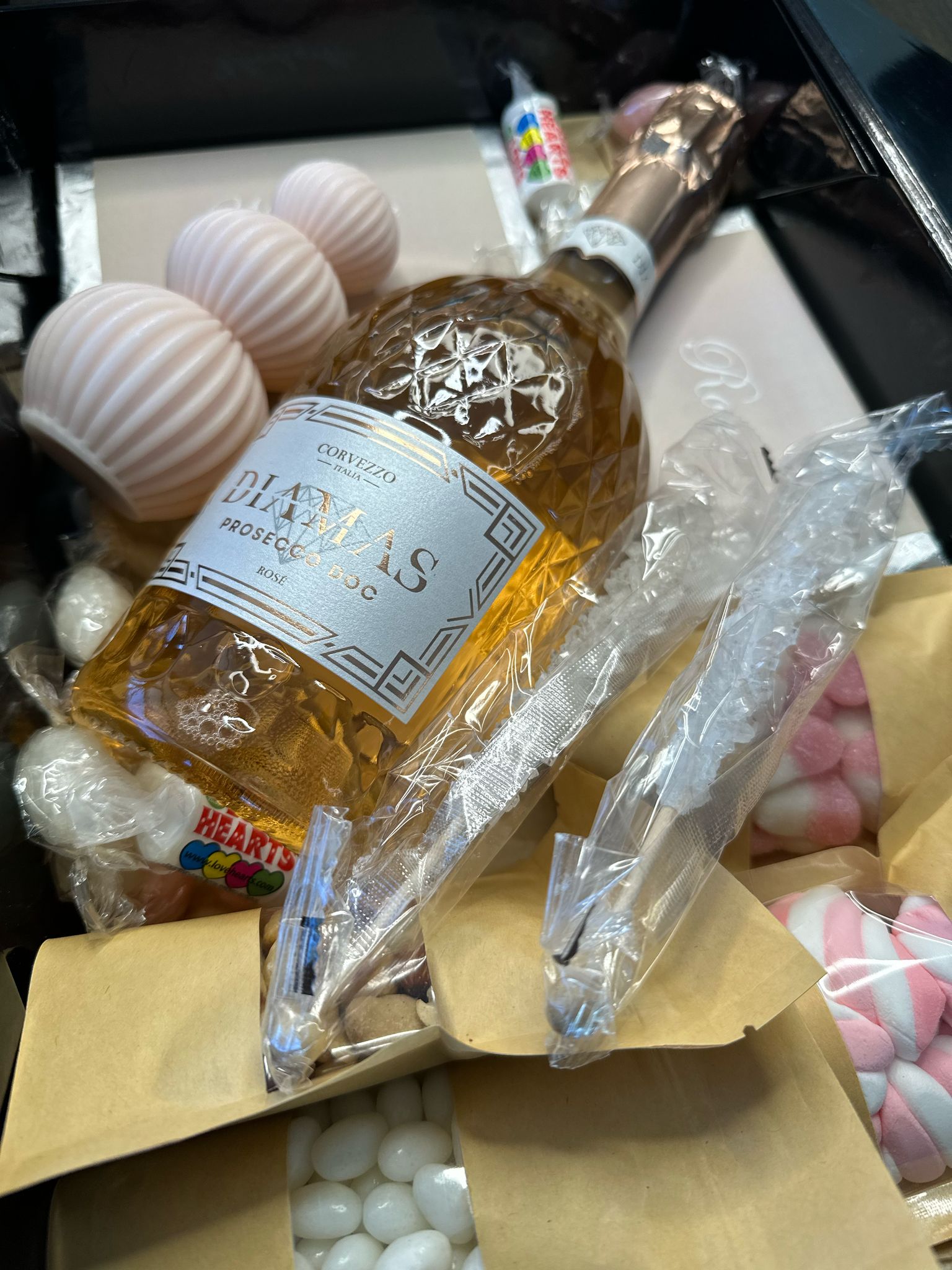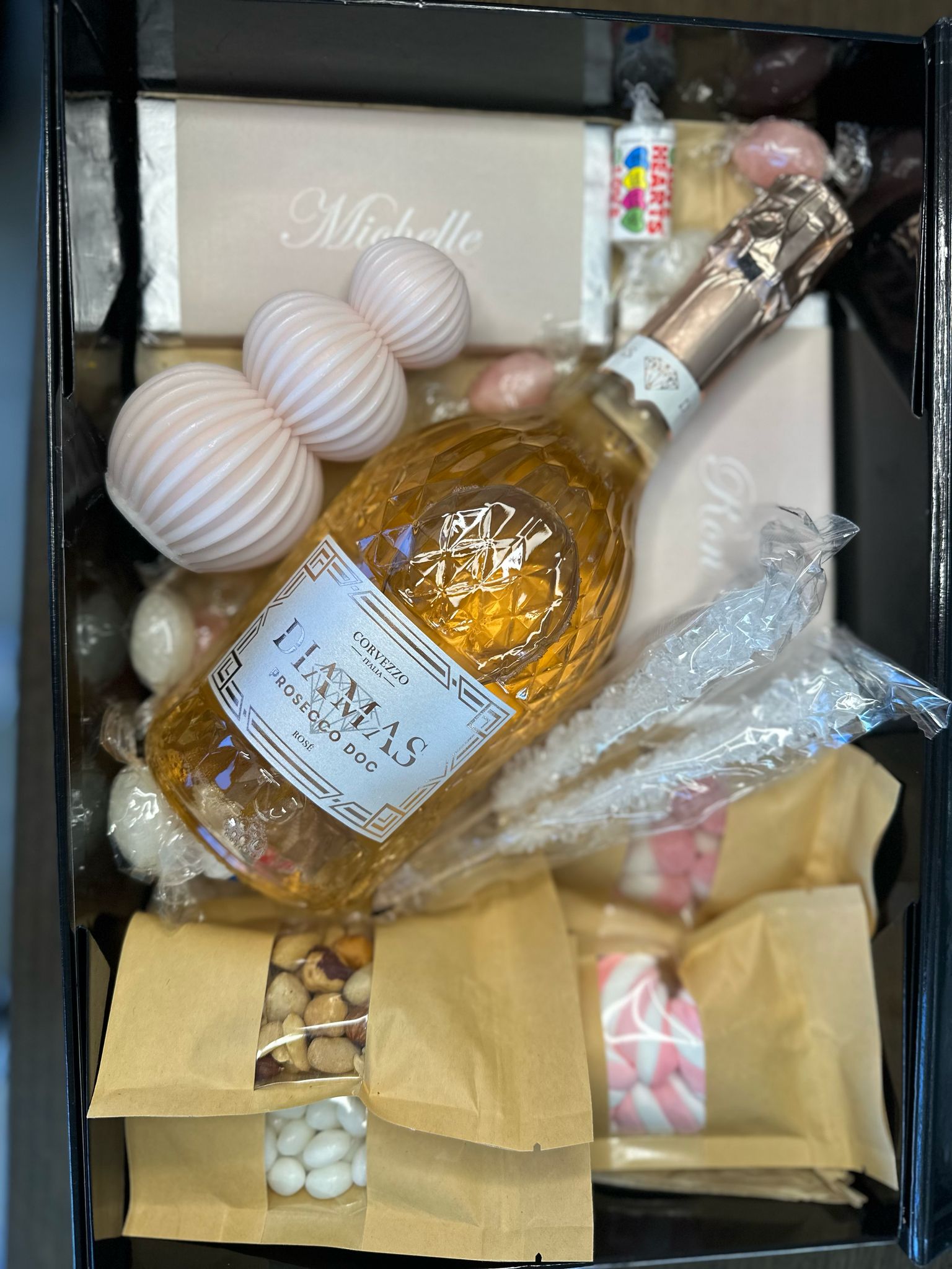 Filled with items like a bottle of prosecco, a scented candle, personalised chocolate bars and candy to make the journey to 'I do' even more special.